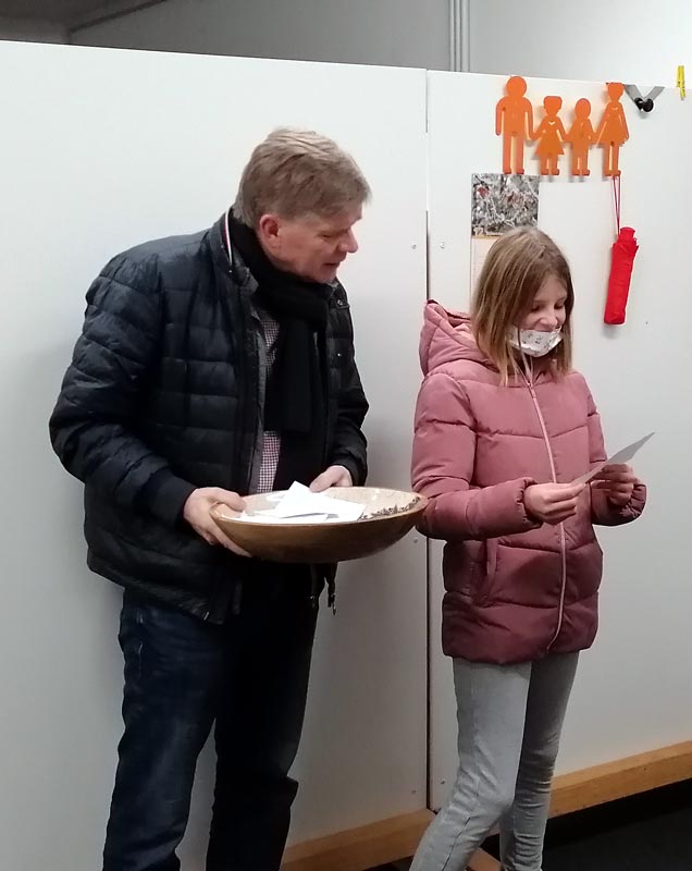 Während der Auswertung bot Maik Bruhn ein Spaßboßeln an. Ein Elternteil und ein Kind bildeten eine Mannschaft. Welche Paarung gemeinsam am nächsten das Punktesoll nach Altersklassen erreicht, hat gewonnen. So freuten sich Jörg Kullak und Tochter Letje über einen Gutschein.